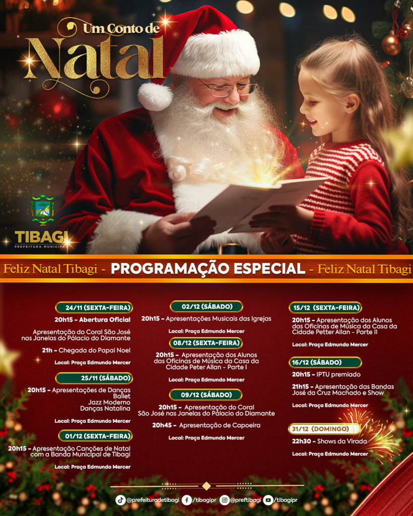 Intitulado “Um Conto de Natal”, abertura acontece no dia 24 de novembro (sexta-feira) com a Cantata nas Janelas do Palácio do Diamante, às 20h15. Eventos vão até o dia 16 de dezembro, sempre as sextas e sábados A Administração Municipal de Tibagi divulgou, nesta quinta-feira (16), a agenda completa das celebrações de final de ano …